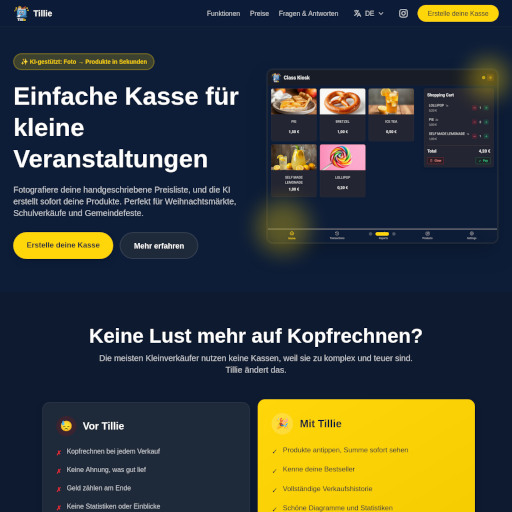 Einfache, mobile Kasse für kleine Events. Foto vom handgeschriebenen Preiszettel machen und per KI Produkte anlegen. Ideal für Weihnachtsmärkte, Schulfeste, Vereinsveranstaltungen und mehr.